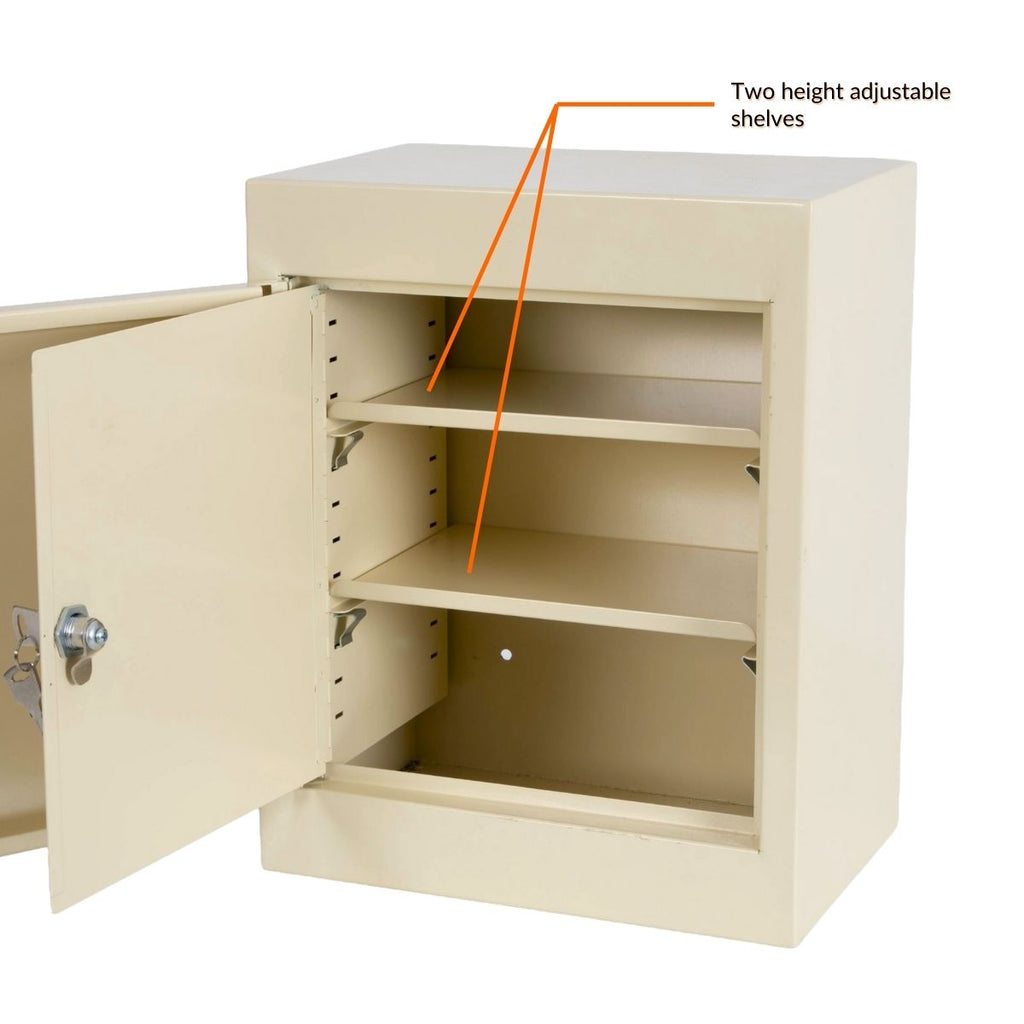 This cabinet features a double-door design with two independent cam locks, each operating with separate keys: